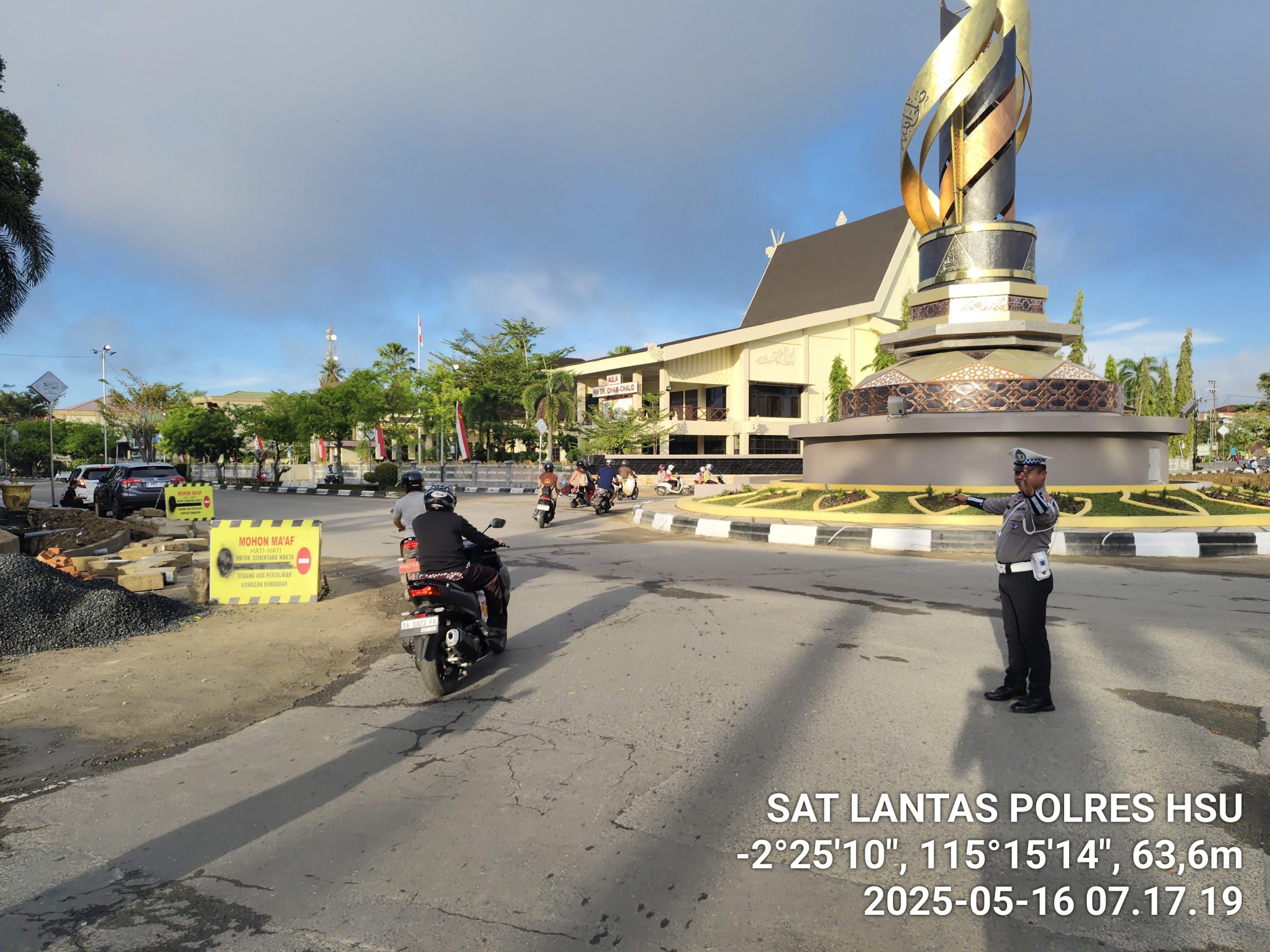 Pada Jumat, 16 Mei 2025, Satlantas Polres Hulu Sungai Utara (HSU) melaksanakan kegiatan apel pagi dan pengamanan di sejumlah ruas jalan utama di Amuntai dan sekitarnya, dimulai pada pukul 06.30 WITA. Kegiatan ini bertujuan untuk memastikan kelancaran lalu lintas serta meningkatkan kesadaran masyarakat dalam berlalu lintas yang aman dan tertib. Kegiatan pengamanan pagi ini meliputi beberapa lokasi strategis seperti Jalan A. Yani, Jalan Basuki Rahmat, Jalan Pangeran Antasari, hingga sejumlah simpang empat yang rawan kemacetan dan pelanggaran lalu lintas.