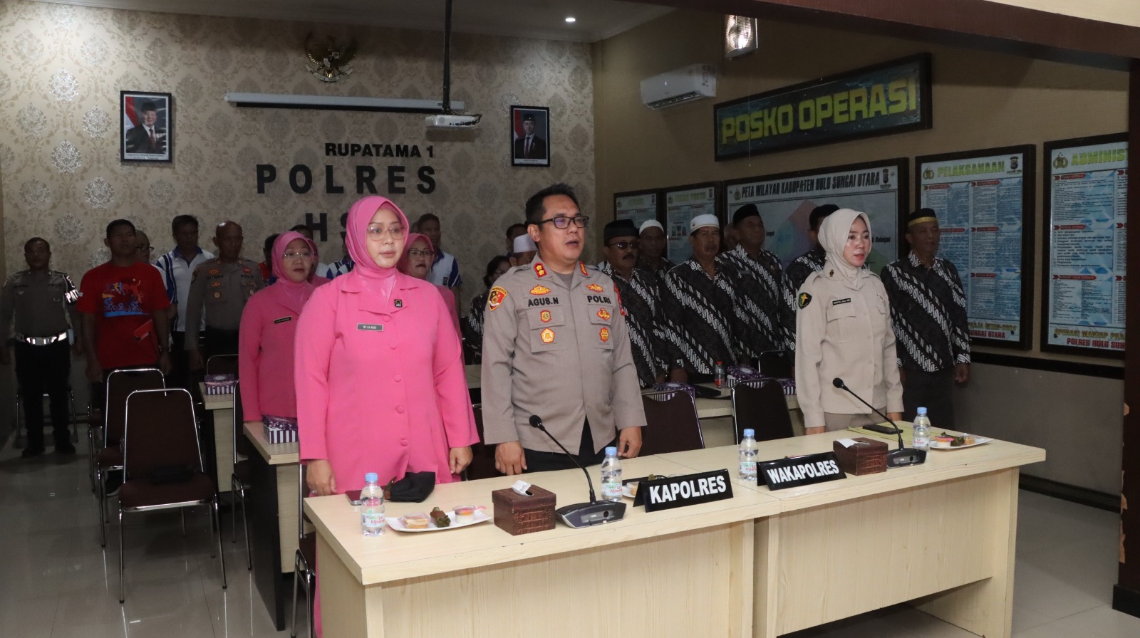 Kegiatan ini turut dihadiri oleh Kapolres HSU AKBP Agus Nuryanto, S.I.K., M.Si., para Pejabat Utama (PJU) Polres HSU, Ketua Bhayangkari Cabang HSU Ny. Lia Agus Nuryanto, pengurus dan anggota Bhayangkari, personel Sidokkes Polres HSU, serta para purnawirawan dan Warakawuri.