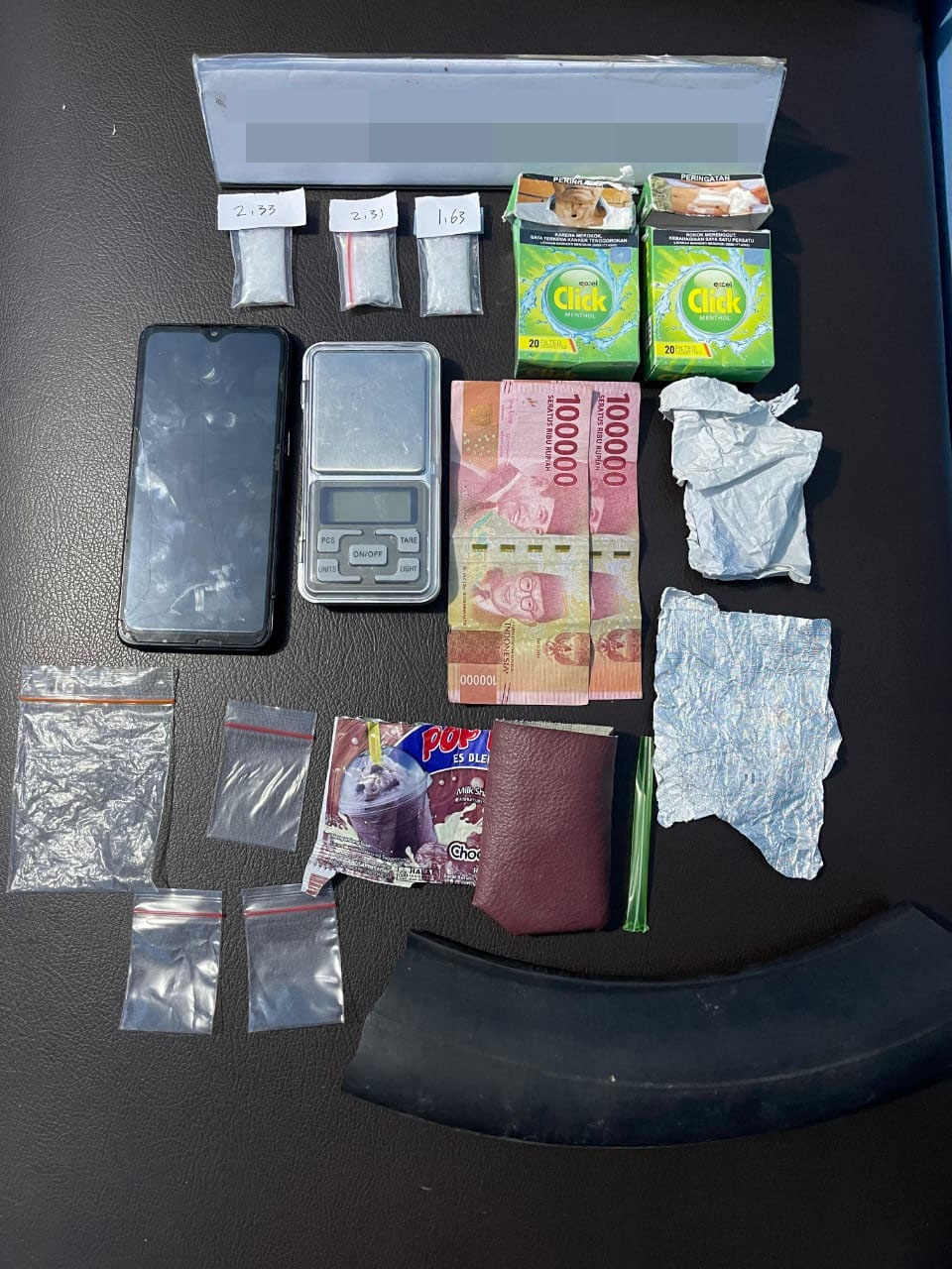 Barang bukti lainnya yang diamankan 1 timbangan digital portable, 1 sendok plastik, 4 lembar plastik klip, uang tunai Rp 200.000, 1 unit HP Realme C2 warna Diamond Blue dan sejumlah barang lain yang diduga berkaitan dengan aktivitas peredaran narkotika.