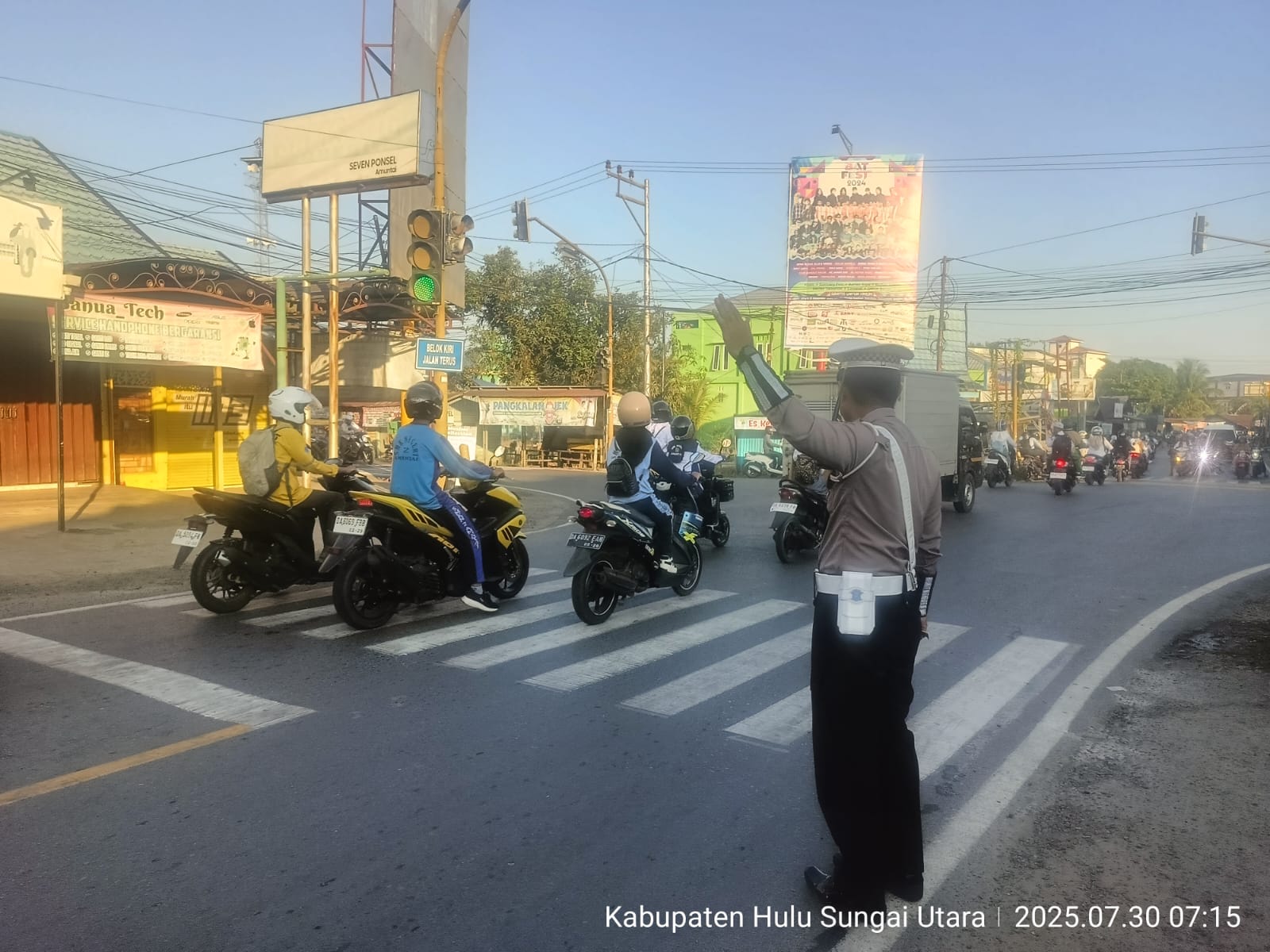 Amuntai – Dalam rangka menciptakan situasi keamanan, keselamatan, ketertiban, dan kelancaran lalu lintas (Kamseltibcar Lantas) yang kondusif di wilayah hukum Polres Hulu Sungai Utara (HSU), Satuan Lalu Lintas (Satlantas) Polres HSU melaksanakan apel pagi dan kegiatan pengamanan serta pengaturan arus lalu lintas di sejumlah titik strategis, Rabu, 30 Juli 2025 mulai pukul 06.30 Wita.
