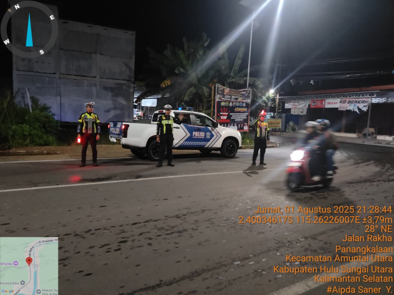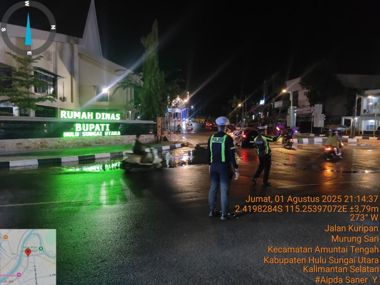 Amuntai, 2 Agustus 2025 — Satuan Lalu Lintas Polres Hulu Sungai Utara (HSU) melaksanakan kegiatan patroli dan pengamanan lalu lintas di sejumlah titik rawan kecelakaan dan pelanggaran di wilayah Amuntai, pada Jumat malam (1/8/2025). Kegiatan yang dimulai pukul 20.30 WITA ini menyasar beberapa ruas jalan utama, yakni Jln. Kuripan, Jln. Basuki Rahmat, Jln. Jend. A. Yani, Jln. Norman Umar, Jln. Biman Villa, Jln. Lambung Mangkurat, dan Jln. Bayur (Baypass Amuntai).