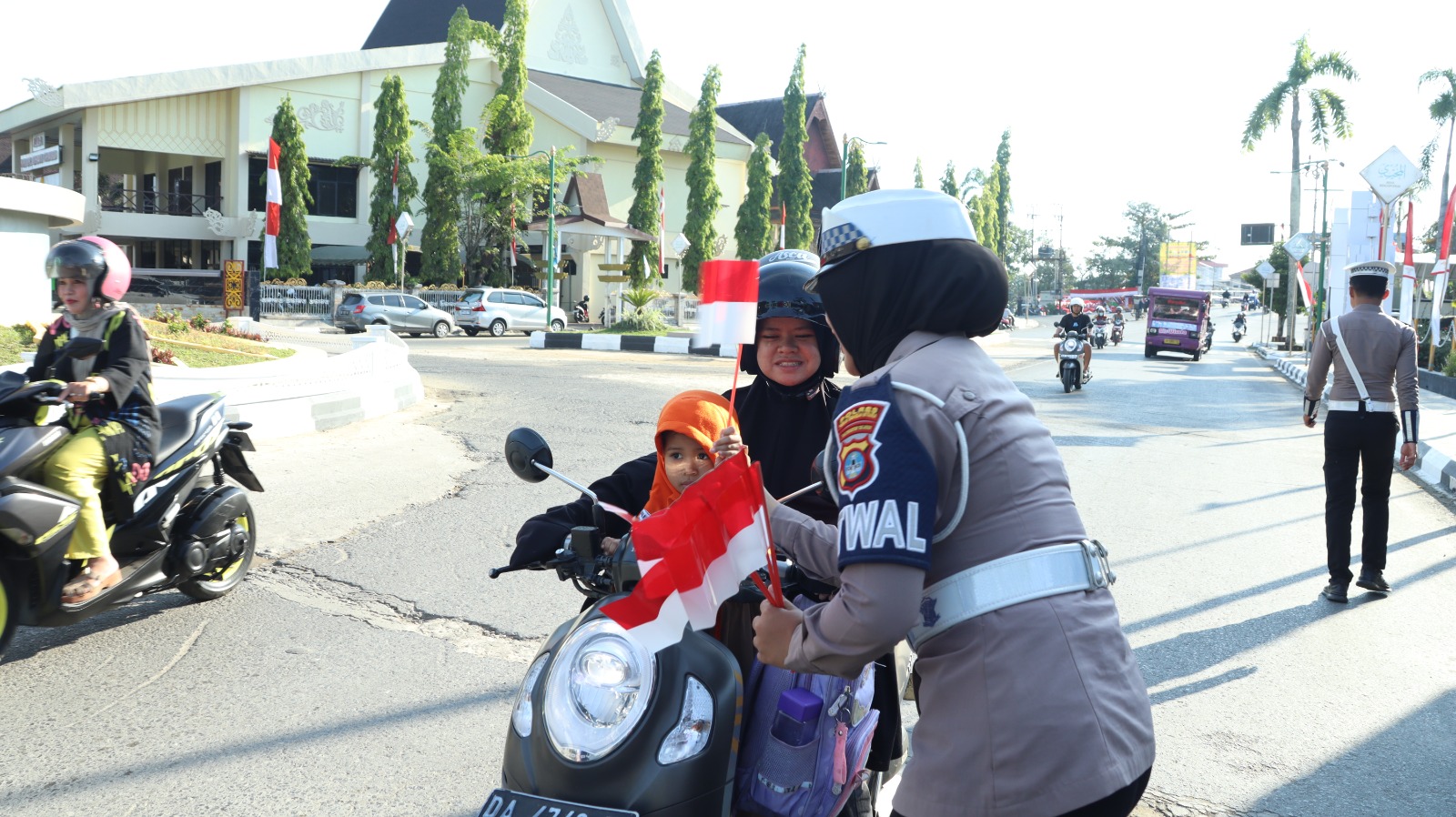 Dipimpin langsung oleh Kasat Lantas Polres HSU, AKP Yuwono, bersama para kanit dan jajaran personel Sat Lantas Polres HSU, kegiatan ini berlangsung penuh semangat dan suka cita. Mereka membagikan 30 lembar bendera merah putih kepada pengguna jalan serta masyarakat yang melintas di lokasi kegiatan. Tak hanya itu, sebagai bentuk pendekatan humanis dan upaya mempererat hubungan dengan masyarakat, Sat Lantas juga memberikan setangkai mawar kepada para pengguna arus lalu lintas sebagai simbol kasih sayang dan perdamaian.