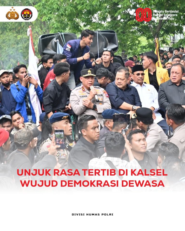 Banjarmasin – Polri melalui Polda Kalimantan Selatan (Kalsel) menyampaikan apresiasi atas pelaksanaan unjuk rasa yang berlangsung aman, tertib, dan kondusif di Gedung DPRD Kalsel pada Senin (1/9/2025). Kapolda Kalsel melalui Kabid Humas Polda Kalsel, Kombes Pol. Adam Erwindi, S.I.K., M.H., mengucapkan penghargaan kepada seluruh peserta…