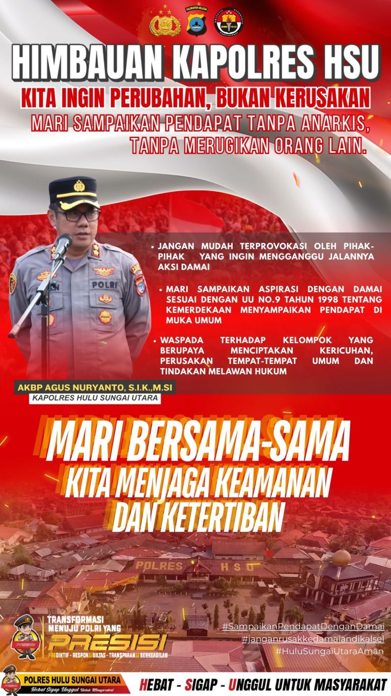 Amuntai – Polres Hulu Sungai Utara (HSU) mengeluarkan imbauan penting kepada seluruh lapisan masyarakat terkait penyampaian aspirasi di muka umum. Imbauan ini disampaikan langsung oleh Kapolres HSU AKBP Agus Nuryanto, S.I.K., M.Si melalui PS. Kasi Humas Polres HSU IPTU Asep…